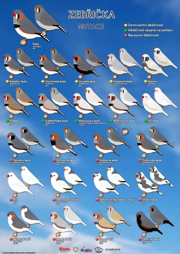 Plakat przedstawia: podstawowe i nowe mutacje zeberek, 23 odmiany barwne, rysunek samca i samicy. Nazwa mutacji w języku czeskim i angielskim (używana w całym świecie). Przy każdej mutacji określony został typ dziedziczności. format A1 (841 mm x 594 mm).